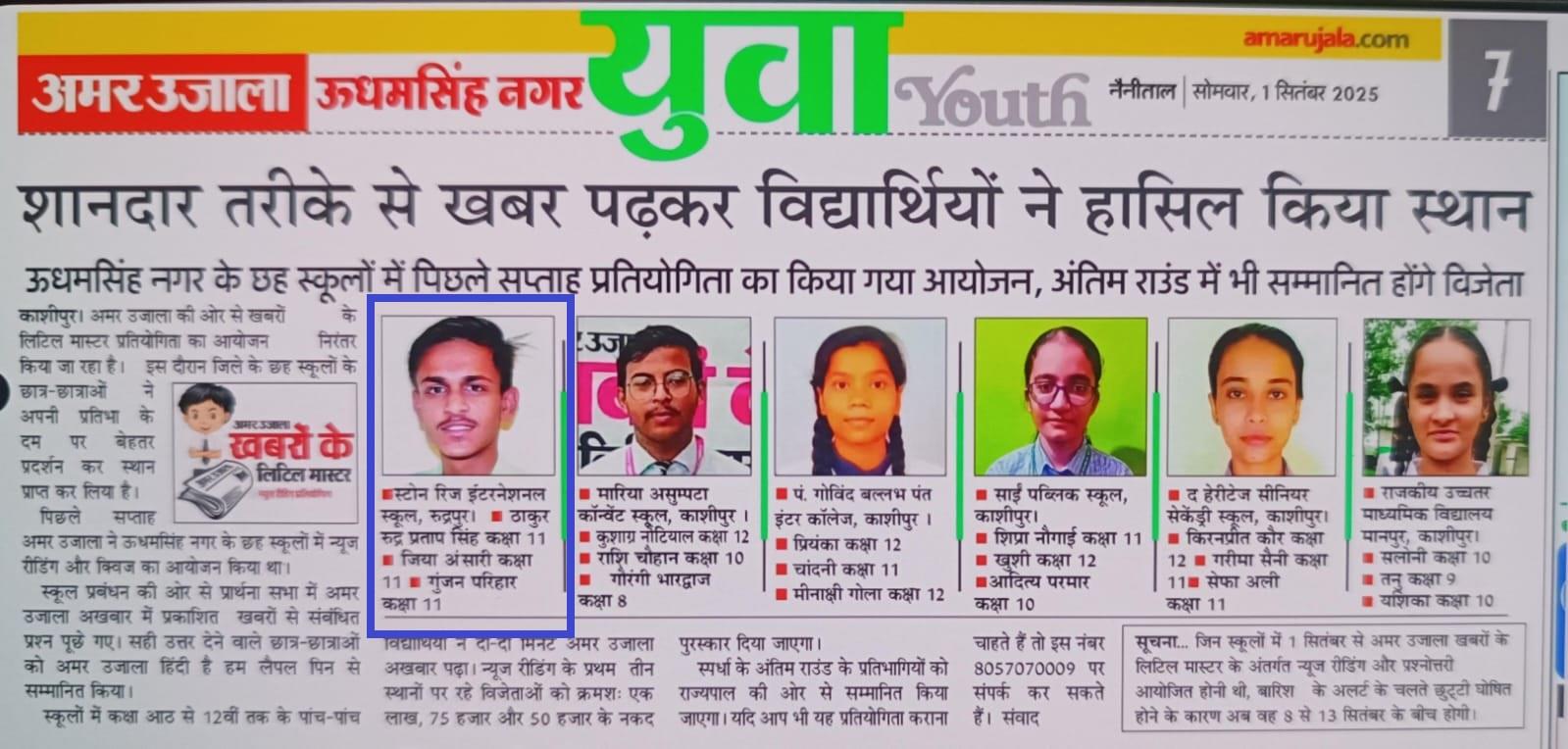 Celebration of Brilliance at Stone Ridge International School We are thrilled to share the resounding success of the Amar Ujala Khabron ke Little Master, hosted at Stone Ridge International School from 26th to 29th August 2025. Over four exhilarating days, our talented students showcased their intellect and eloquence through two engaging segments: Newspaper Reading and a Question-Answer Session based on the previous day’s news. With five students participating daily, their passion for knowledge and articulate expression left an indelible mark. We proudly announce the winners of the Question-Answer Session: Day 1 ➢ Thakur Rudra Pratap Singh (XI Maths) ➢ Jiya Ansari (XI Humanities) ➢ Geetika Verma (X C) Day 2 ➢ Mansa Rawat (XI Bio) ➢ Avantika Mishra (XI Bio) ➢ Khushi Yadav (VII A) Day 3 ➢ Gunjan Parihar (XI Bio) ➢ Nisha Tamta (XI Bio) ➢ Shreyashi Verma (X C) Day 4 ➢ Harsh Kumar Sharma (XI Bio) ➢ Manvi Gangwar (XI Maths) ➢ Aakriti Johari (X C) In the Newspaper Reading Contest, our students shone brightly: ➢ Thakur Rudra Pratap Singh (XI Maths) clinched First Place, triumphantly qualifying for Round 2 ➢ Jiya Ansari (XI Humanities) secured Second Place. ➢ Gunjan Parihar (XI Bio) earned Third Place. Our heartfelt congratulations go to all participants for their stellar performances Their dedication was warmly appreciated by our esteemed Principal, Mr. Sanjeev Stephen, whose encouragement continues to inspire our students to reach new heights. The runner-ups will be honored with participation certificates by the esteemed officials of Amar Ujala, to be distributed alongside the results of Round 2 in October–November 2025. This event exemplifies our commitment to fostering intellectual curiosity and critical thinking. Stay tuned for more updates, and let’s Let us rally in support of Thakur Rudra Pratap Singh as he embarks on the next chapter of this illustrious journey in Round 2. #stoneridgeinternationalschool #ProudMomentSRIS #StoneRidgePride #AmarUjalaContest2025 #ExcellenceInEducation #FutureLeaders #NewspaperReadingChampions #IntellectualTriumph